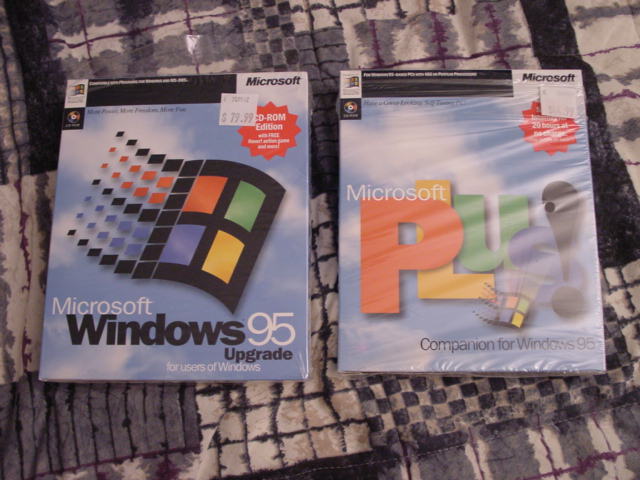 In late 1995, Microsoft released Windows 95 and PCs suddenly sucked alot less. I bought the $79.99 upgrade and the 44.99 PLUS! add on package. Here they are, in case there is such a thing as a Microsoft "collector". These are the early versions (before all the service packs and updates) so you wouldn't actually want to install them, but they do unlock upgrades. I guess you could use these to unlock a copy of Windows 98 or ME or something...